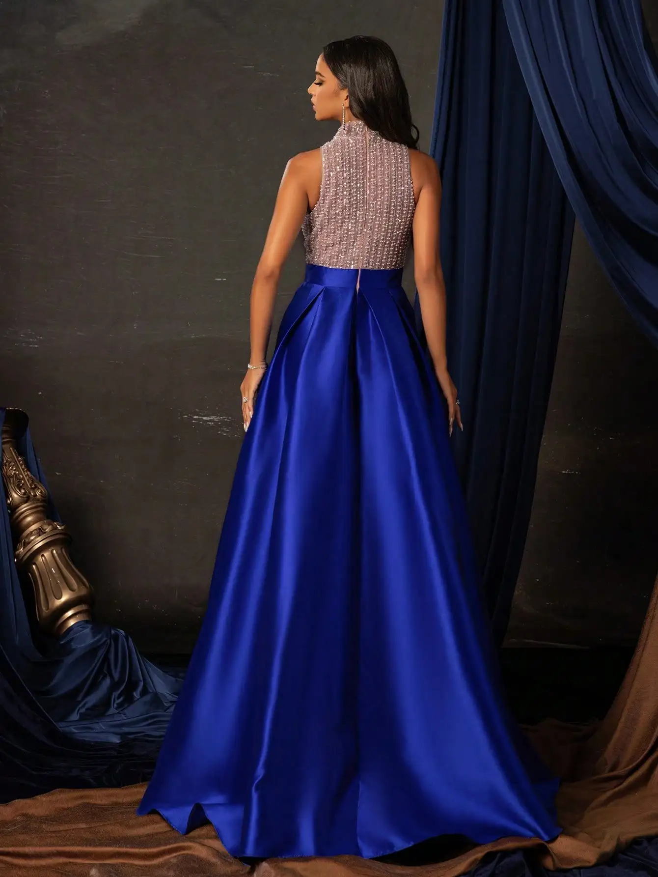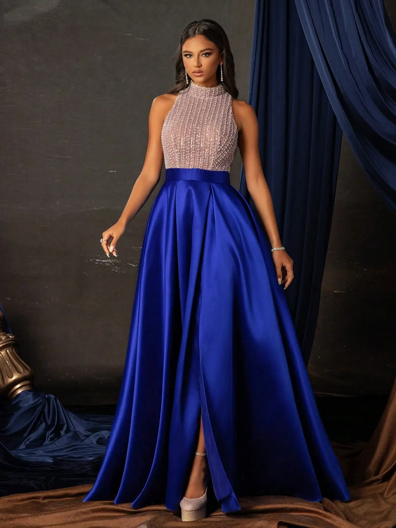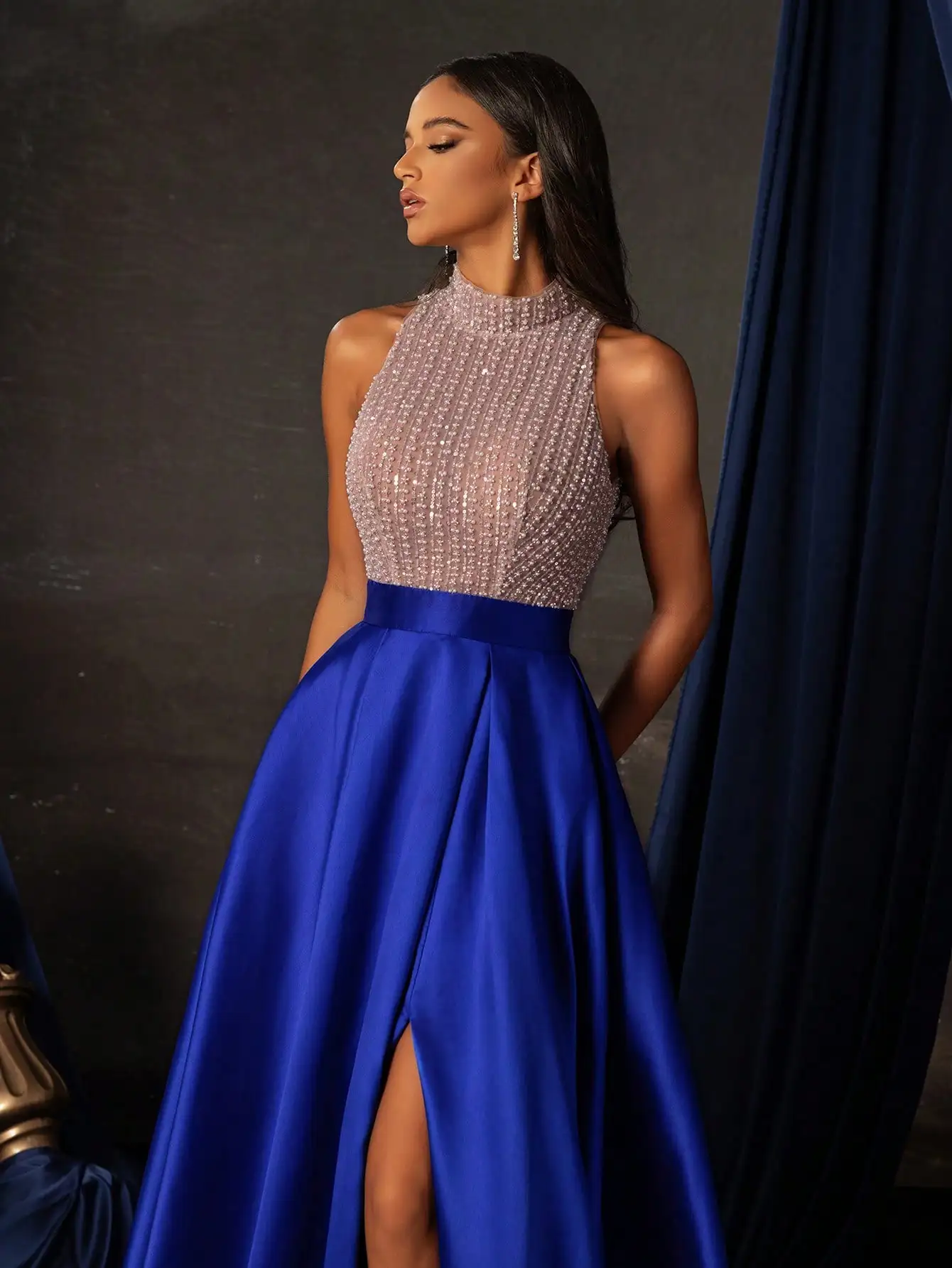 This stunning evening gown features a high-neck bodice adorned with shimmering sequins and pearl inlays, paired with a flowing royal blue satin A-line skirt. The high slit adds a touch of modern elegance, making it perfect for proms, weddings, or formal dinners. Designed to flatter the silhouette with its structured fit and luxurious fabric.