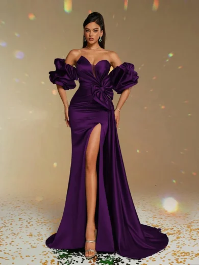 Elegant Purple Off-Shoulder Satin Evening Gown with Ruffle SleevesHigh Slit & Bow Detail for Prom, Wedding Guest or Formal Party