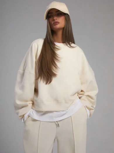 Cream Oversized Cropped Sweatshirt with Drop Shoulder Long Sleeve