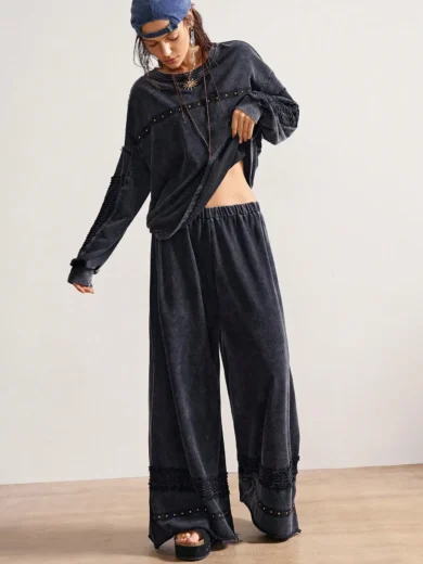 Distressed Velvet 2-Piece Set: Loose Crewneck Top & Wide Leg Pants