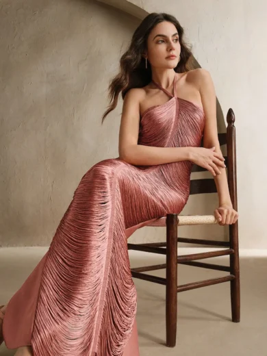 Dusty Rose Halter Neck Fringe Maxi Dress, Elegant Evening Gown for Formal Events