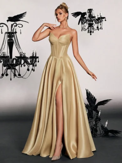 Elegant Strapless Satin Gown with High Slit, Formal Evening Dress for Wedding Guest or Party