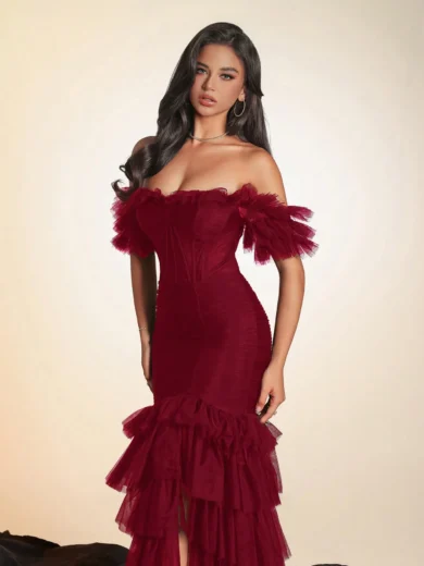 Elegant Off Shoulder Ruched Mermaid Dress with Tulle Ruffles for Prom Wedding Guest Party