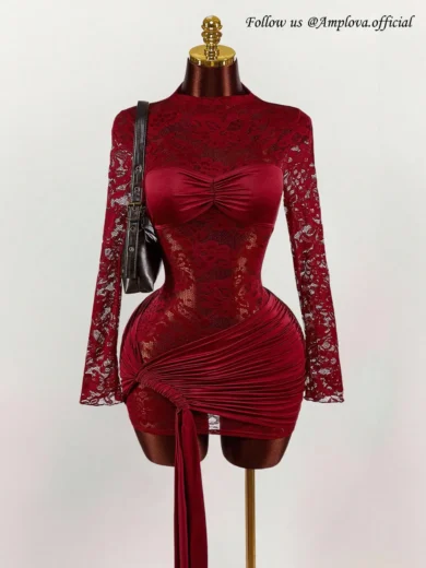 Red Lace Bodycon Mini Dress with Long Sleeves, Ruched Bust & Drawstring Hem for Party Night Club