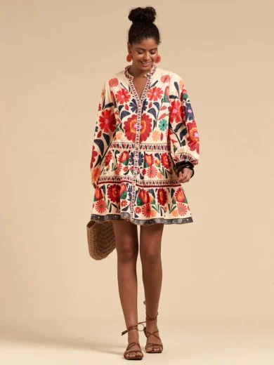 Floral Print Loose Smock Dress with Long Sleeves, V Neck, Tiered Hem for Summer Vacation or Casual Wear