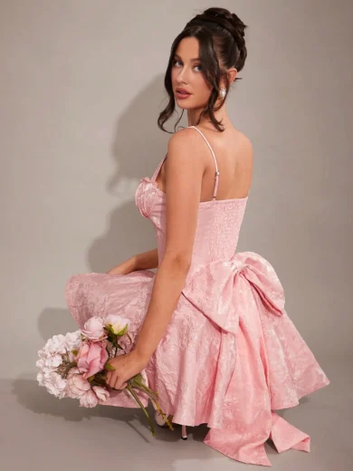 Pink Floral Jacquard Dress with Ruched Bodice and Bow Detail