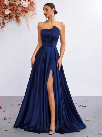 Navy Blue One-Shoulder High Slit A-Line Evening Dress for Formal Events