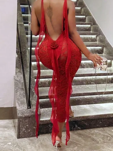 Red Lace Backless Maxi Dress with Spaghetti Straps and Sheer Detail, Sexy Party Wear