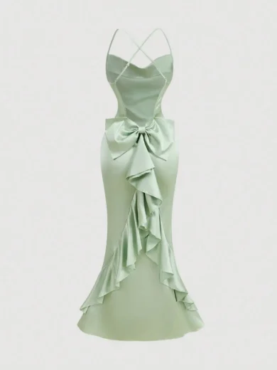 Mint Green Satin Mermaid Dress with Back Bow & Ruffles, Cross-Strap Design for Formal Parties