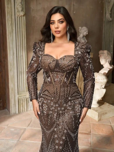 Plus Size Coffee Brown Beaded Mermaid Dress with Sweetheart Neck & Long Sleeves for Weddings, Parties, Formal Events