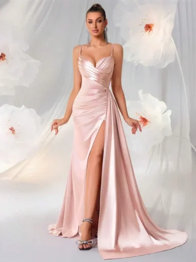 Plunging V-Neck Spaghetti Strap Prom Gown With Thigh High Slit, High Waist Backless And Tie-Up Design, For Ball