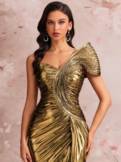 Metallic Gold Asymmetric One-Shoulder Pleated Mermaid Evening Dress for Formal Parties & Wedding Guests