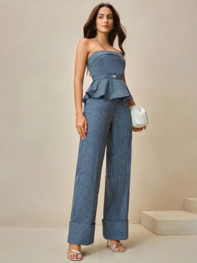 Women's Blue Striped Strapless Peplum Top & Wide Leg Pants Set