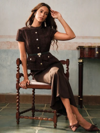 Women's Coffee Brown Tweed & Satin Patchwork Dress with Fishtail Hem