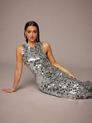 Silver Sequin Sleeveless Maxi Dress with High Slit, Elegant Party Gown for Evening Events
