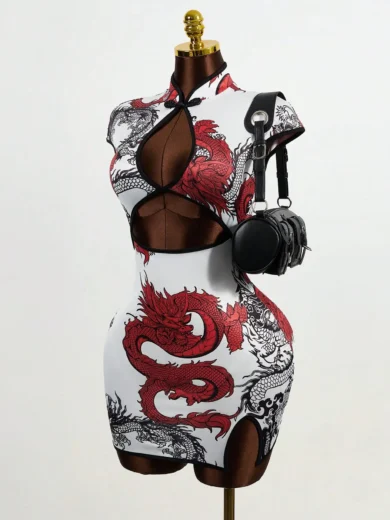 Women's Chinese Dragon Print Hollow-Out Bodycon Dress with Puff Sleeve and Button Detail