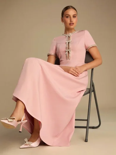 Spring/Summer Romantic Women's Baby Blue Sparkle Rhinestone & Pearl Bowknot Decor Short Sleeve Princess Maxi Dress,Sweet&Elegant